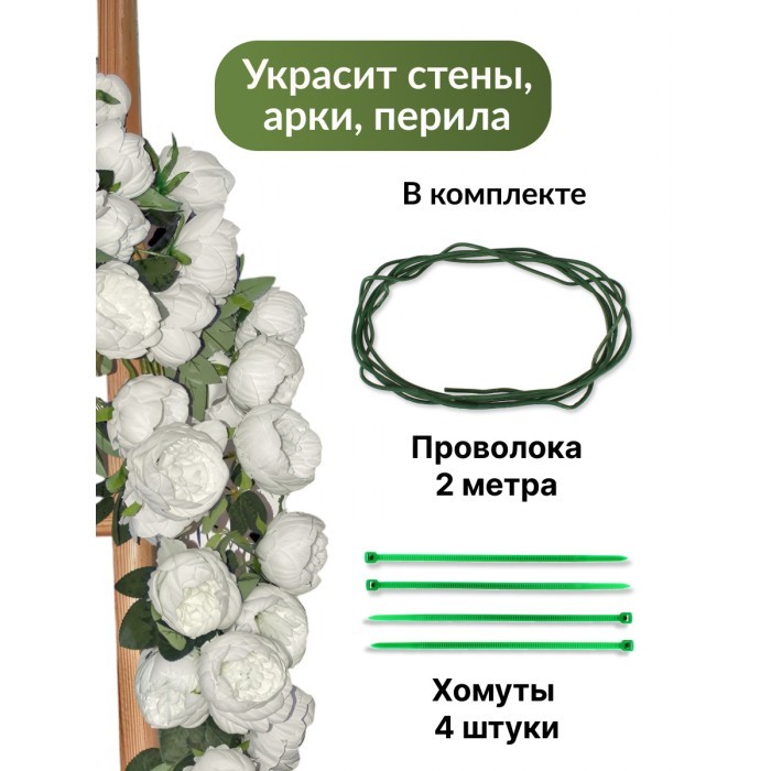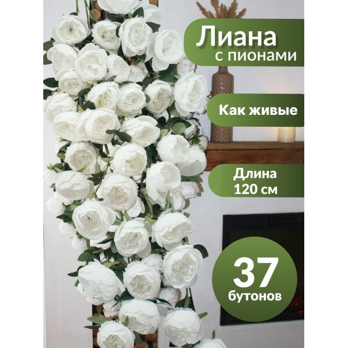 Цветы искуственные Пионы каскадные (37 штук, 120 см, цветок 10 см) белый 265452