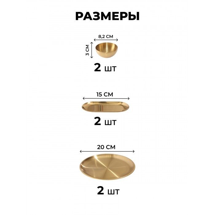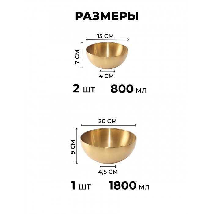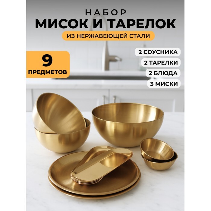 Набор Мисок из нержавеющей стали 9шт (15см- 2шт+20см-1шт+тарел 20см-2шт, бл.овал 18см-2шт, соус-2шт) золото 266206